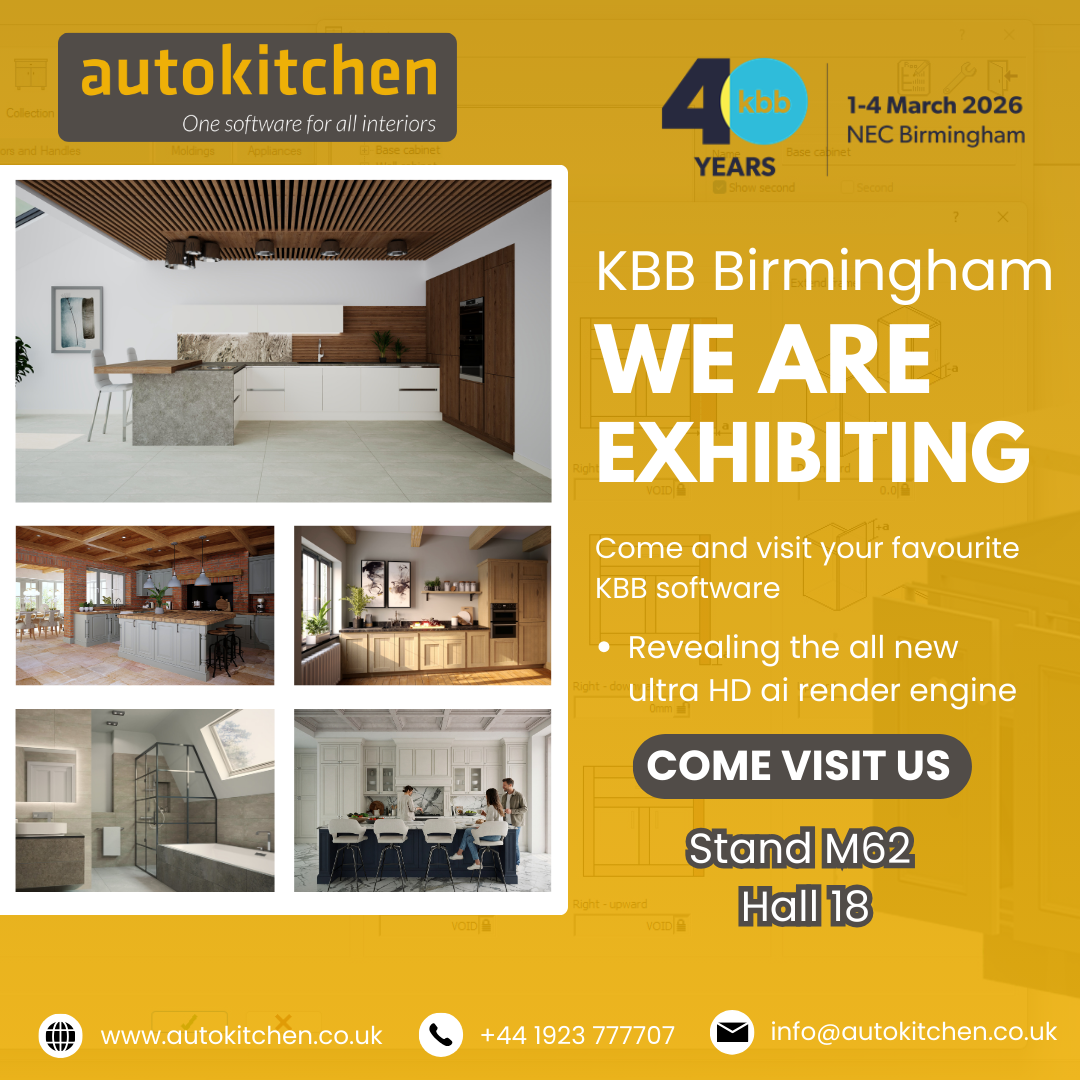 KBB is the UK’s leading event for the kitchen, bedroom and bathroom industry, bringing together manufacturers, retailers, designers and innovators from across the sector. For us, it is the perfect platform to demonstrate how Autokitchen continues to push the boundaries of design, rendering and manufacturing integration.